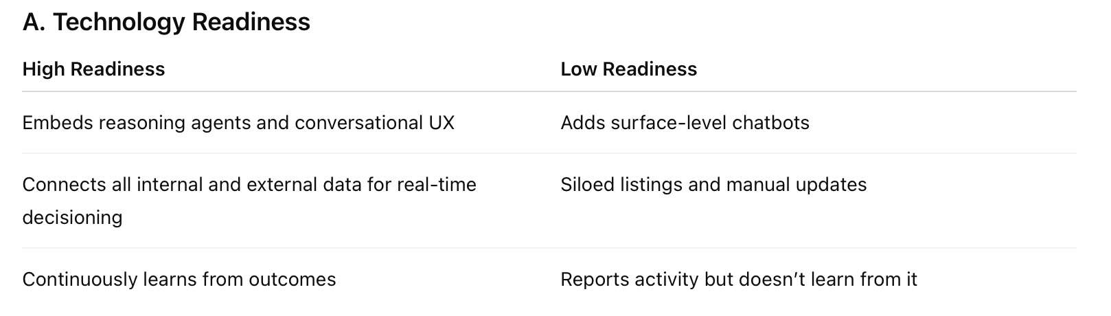 High ReadinessLow ReadinessOpens APIs for agentic collaborationStays closed and protectiveMoves toward verified-outcome or success-based pricingClings to lead sales and adsBuilds verified trust systemsKeeps anonymous listings